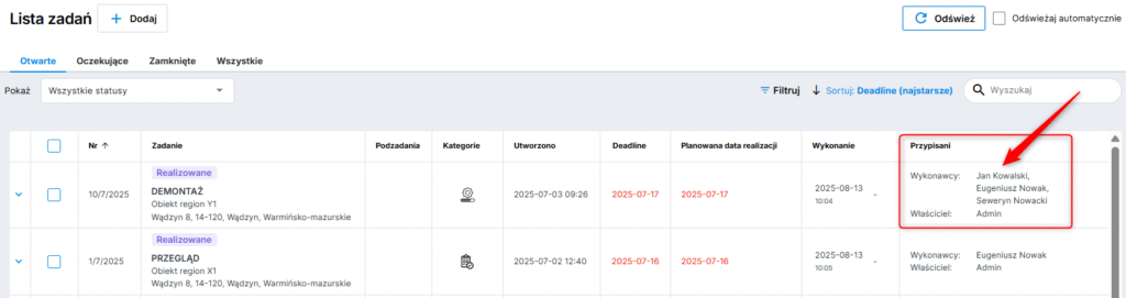• Zmiana sposobu wyświetlania wykonawców na liście zadań