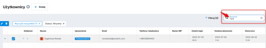 • Wyszukiwanie po numerze telefonu w zakładce Administracja – Użytkownicy