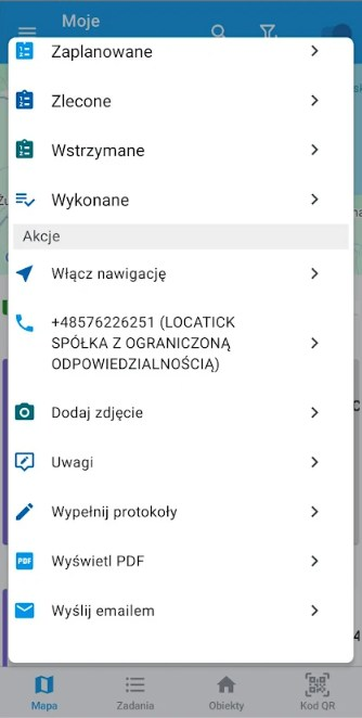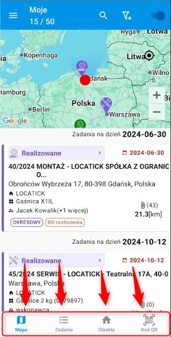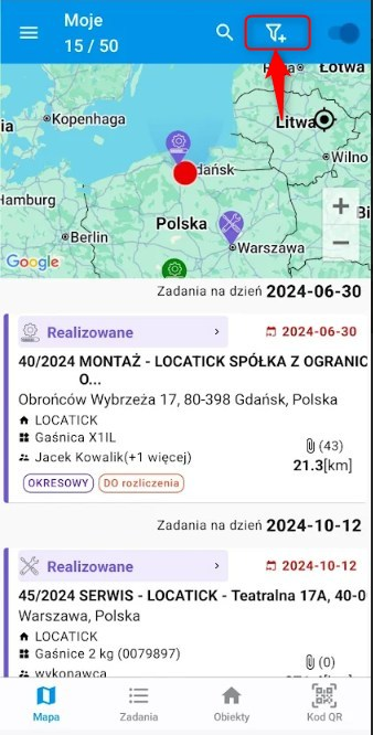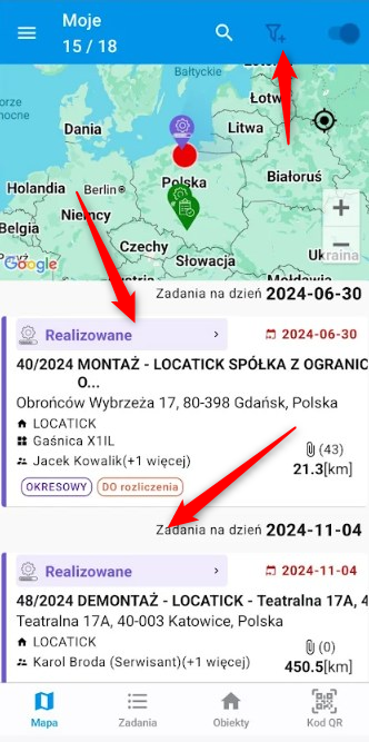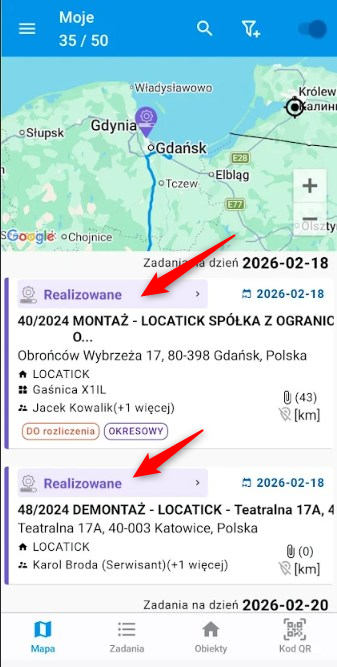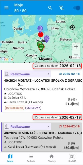 • Podgląd listy zadań na mapie