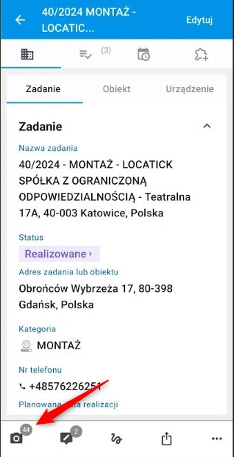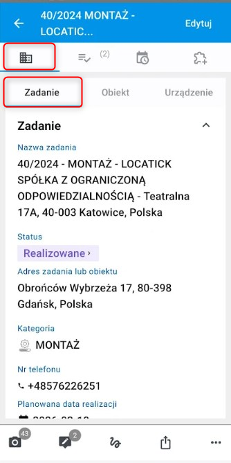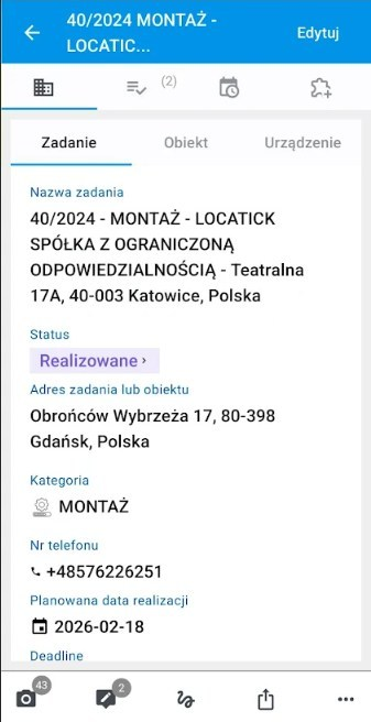 W zakładce zadanie 1) widzimy wszystkie informacje dotyczące zadania, takie jak data deadline i planowana  data realizacji, planowany czas trwania, opis, miejsce i urządzenie, którego dotyczy zadanie.
