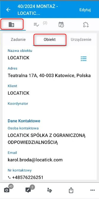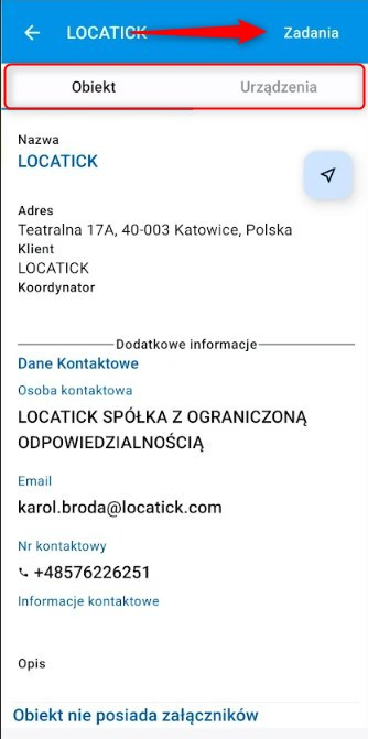W podzakładce „Obiekt” pojawiają się informacje szczegółowe dla obiektu, który jest przypisany do zadania. Znajdziemy tutaj dodatkowe informacje jak np. dane do osoby kontaktowej lub pliki obiektu takie jak np umowy lub inne dokumentacje (jeśli zostały dodane)