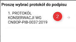 Aby podpisać protokoły należy nacisnąć ikonę podpis (1), wybrać protokół do podpisu z listy (2) oraz