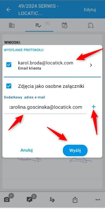 Wyślij e-mail – po kliknięciu wyświetlona zostanie lista adresów e-mail przypisanych do danego obiektu. Jeśli dany adres ma otrzymać protokoły, pozostawiamy go zaznaczonego. Aby dodać dodatkowy adres e-mail klienta, wpisujemy go w przeznaczone do tego pole i klikamy ikonę „+”. Następnie wybieramy opcję „Wyślij”, co spowoduje przesłanie protokołu na wskazany adres e-mail.
